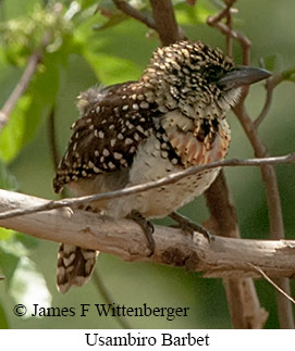 Dec 24 we birded the escarpment all day. Some game animals are present, seeking refuge from lions that generally stay out of Masai land outside the park itself. Nevertheless, it's safe enough to bird on foot during daytime. We saw a number of species near the lodge, notably Crowned Hornbill, Spot-flanked Barbet, Rufous-necked Wryneck, Nubian Woodpecker, Black-crowned Tchagra, and Violet-backed Starling. Later that morning and all afternoon we birded a nearby area on the escarpment by vehicle. There we picked up Egyptian Vulture, Crowned Lapwing, Narina Trogon (seen briefly by a few of us), and Usambiro Barbet (a possible future split from D'Arnaud's Barbet) among other species.